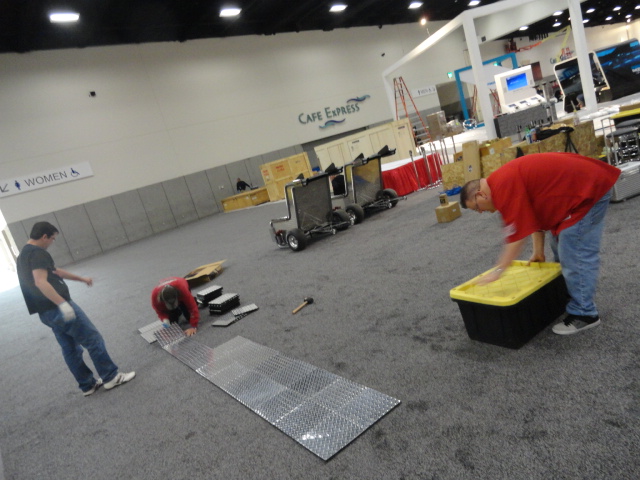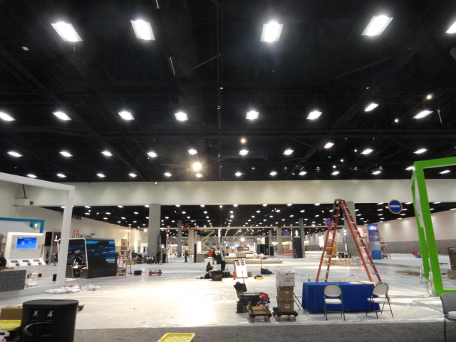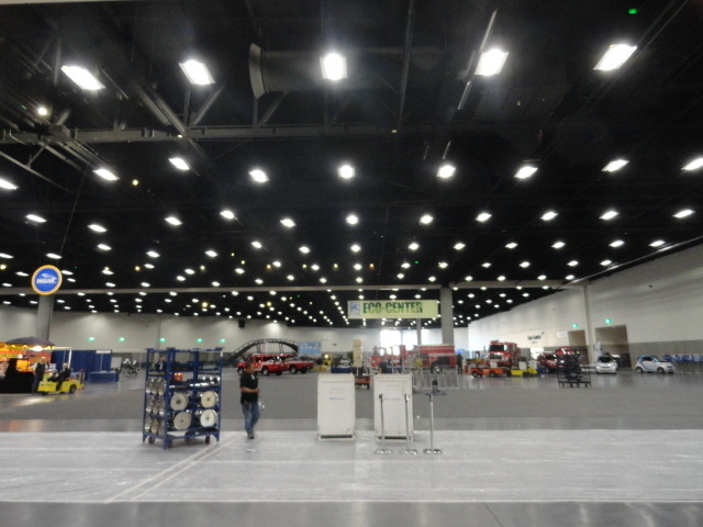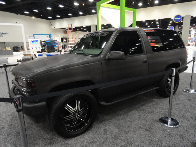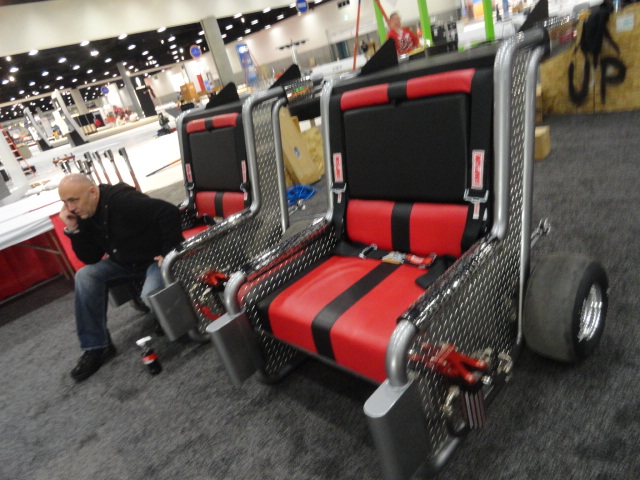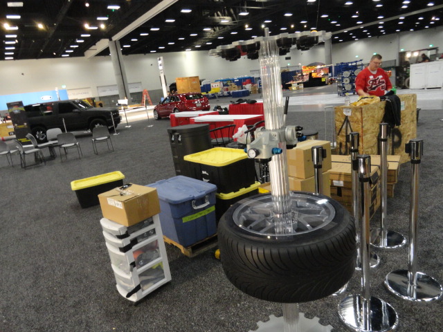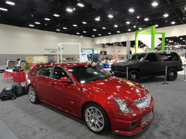 Officially DAY 1 ends in a hoopla of activity as we set up the booth, rolled in the Caddy and Tahoe and watched the Convention Center go from a bustling city to a ghost town by 6pm. We were the last ones out, but that took a while because there were cool car distractions, dangit! Above… Booth Babes Ally and Kim Wood were pounding RaceDeck for hours, and now they have Ahnuld Muscles. Doooooosh….