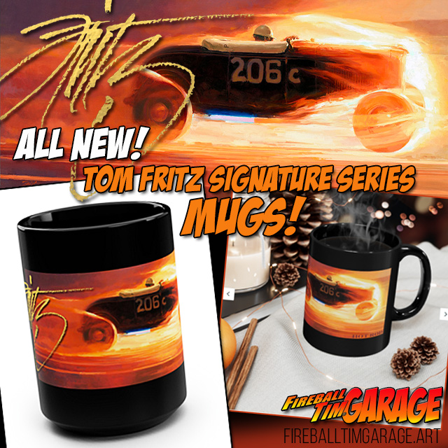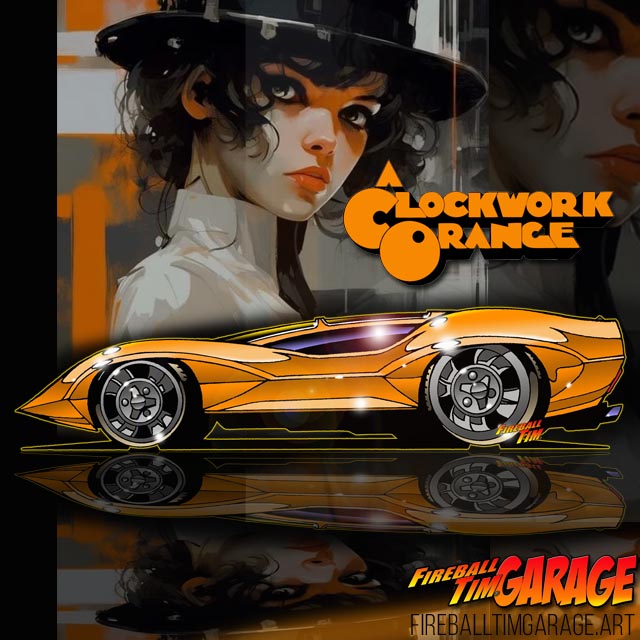 Well this is true, but today… it’s the crazy orange sleek wedge that was called the Durango 95 from A CLOCKWORK ORANGE! The car was actually a M-505 Adams Brothers Probe 16. Fireball’s now got it on MUGS & PRINTS, …but if you want it on something FRESH, … REACH OUT!